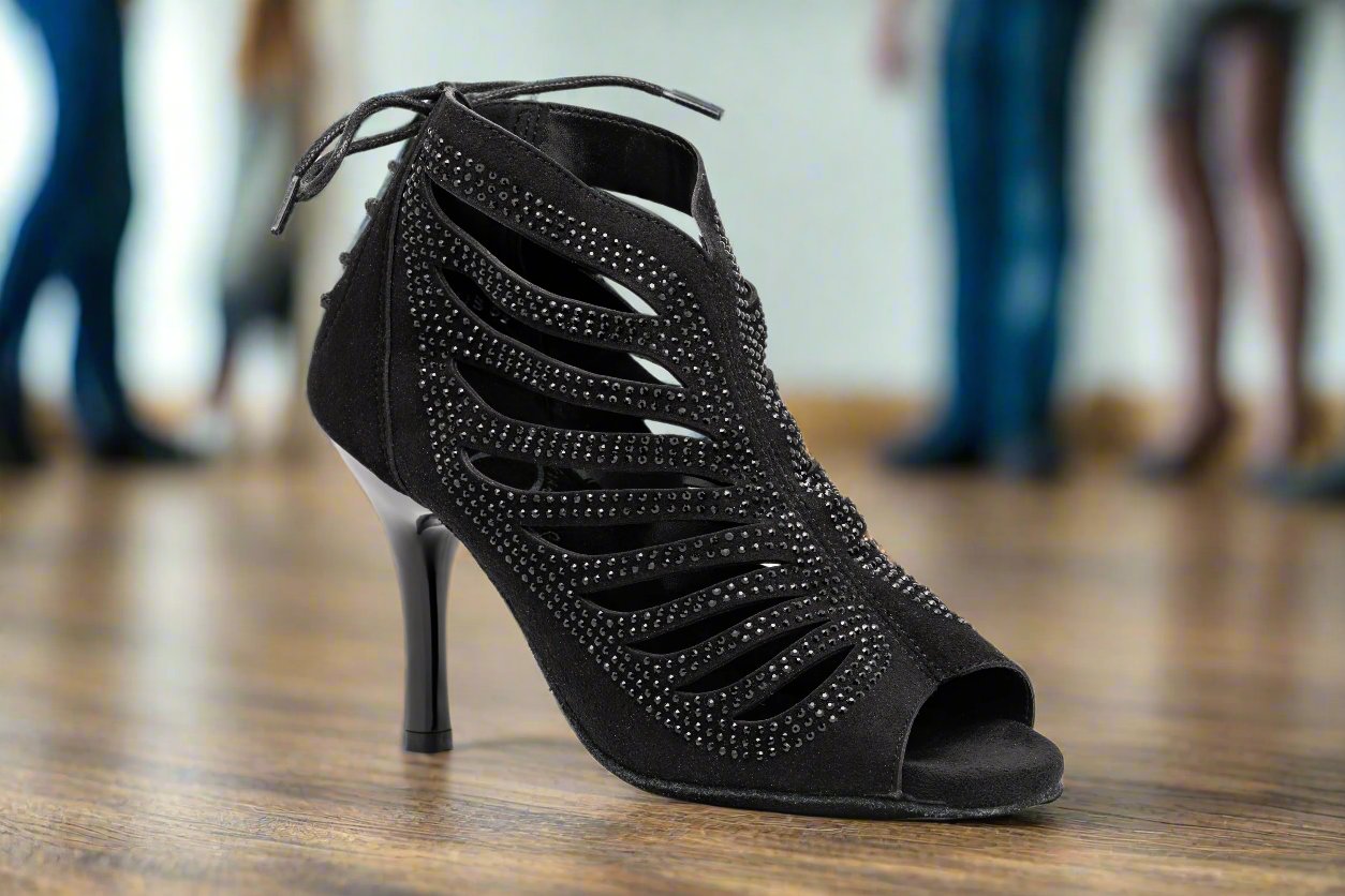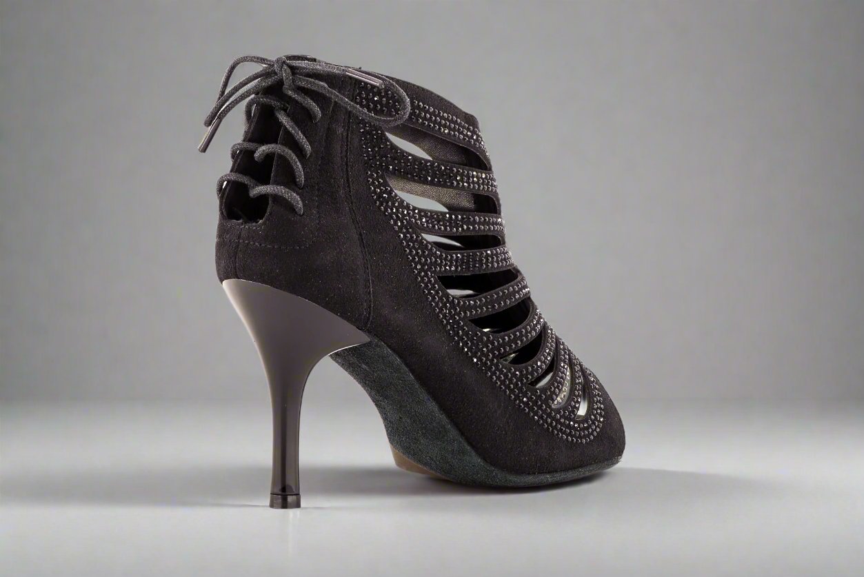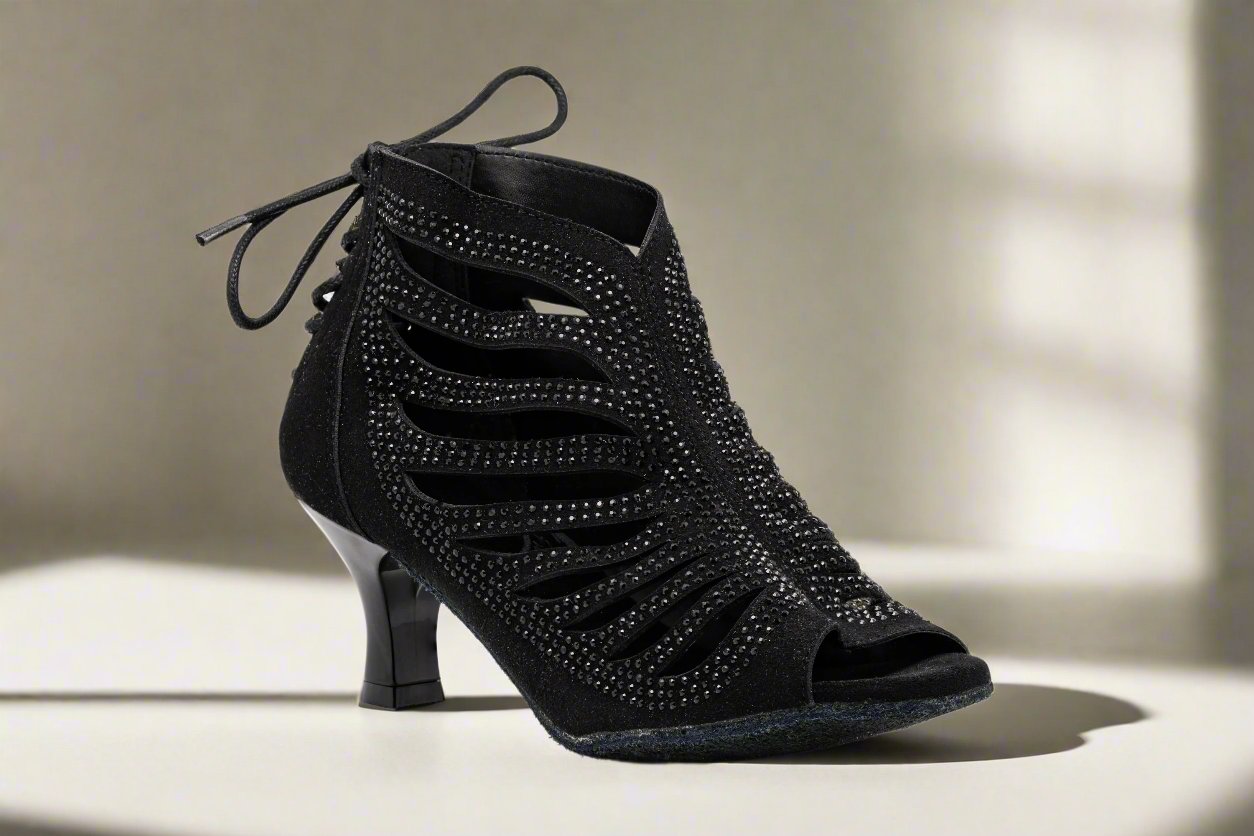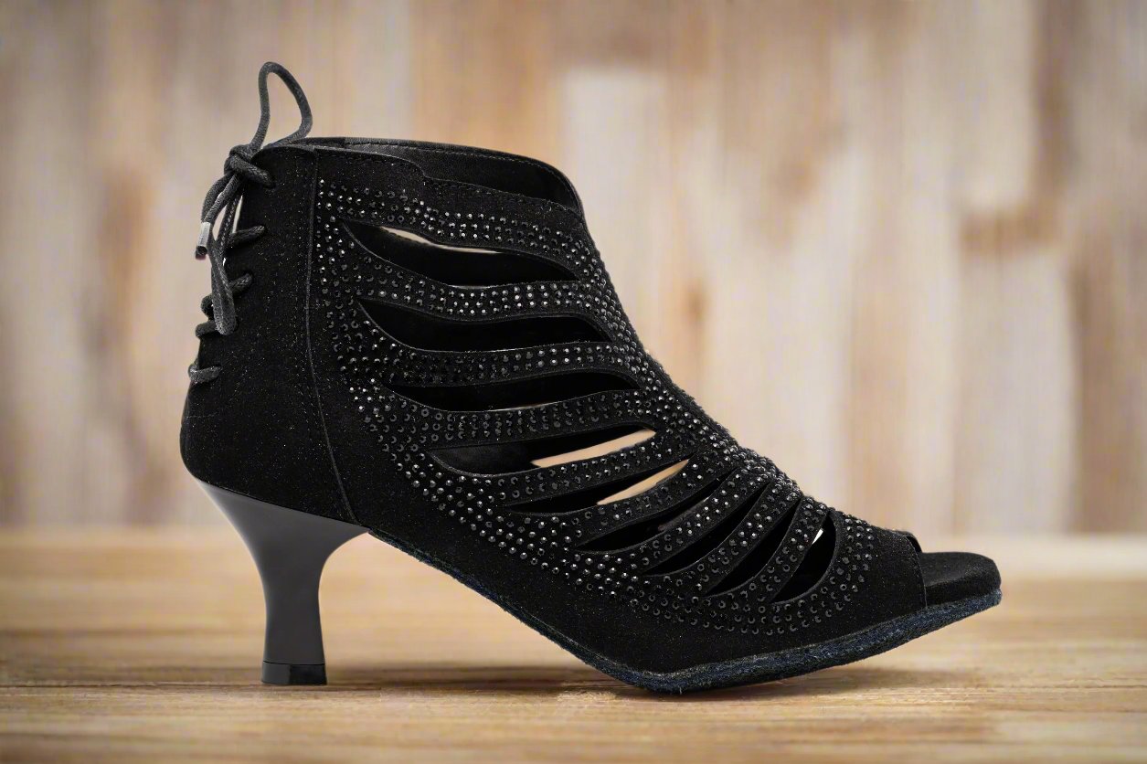 The GFranco Miami style dance booties features strategically laser cut openings with black rhinestones. This style is available in a 3 inch and 2.5 inch heel.