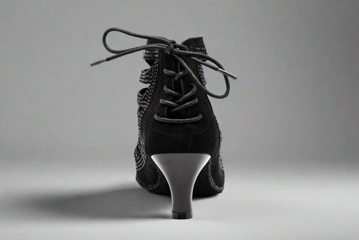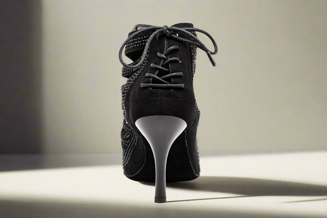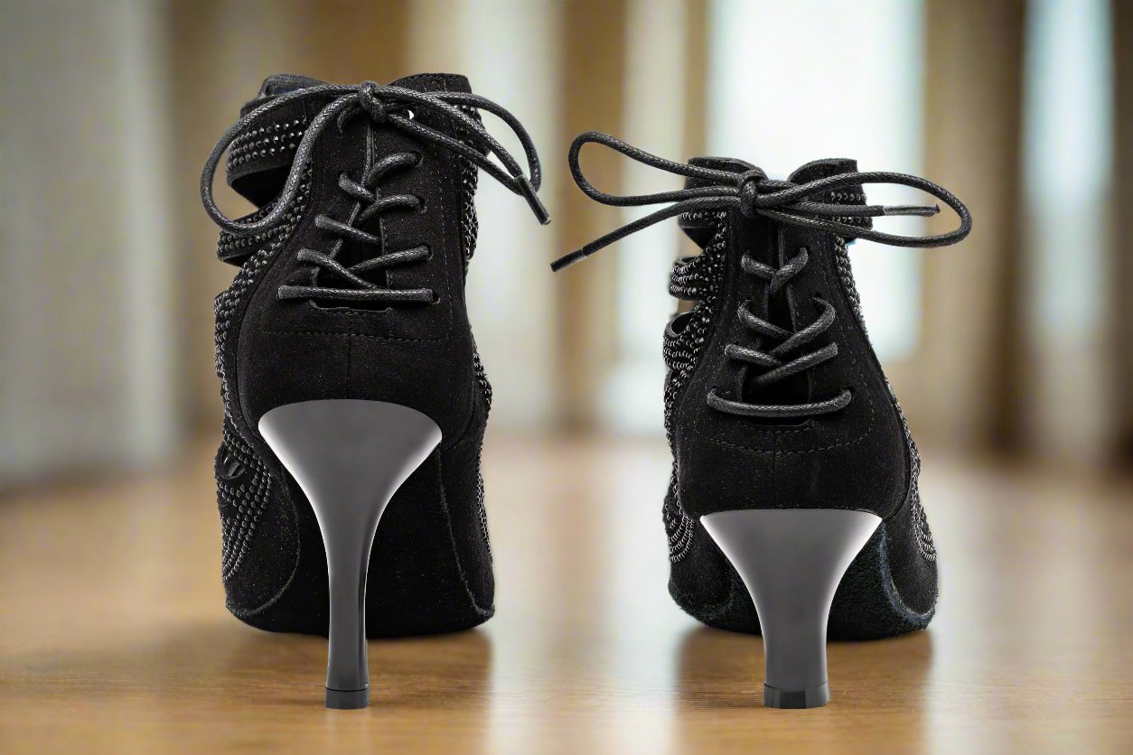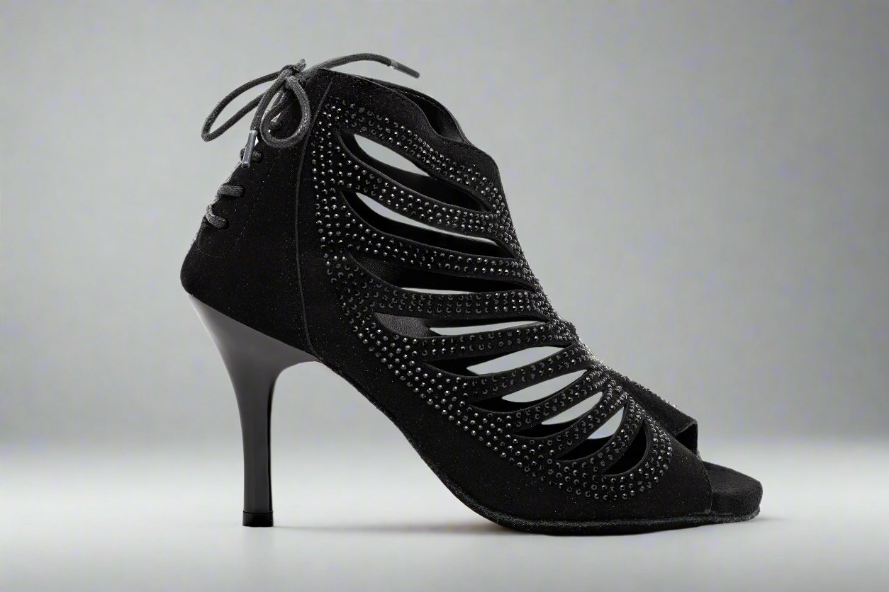 The GFranco Miami style dance booties features strategically laser cut openings with black rhinestones. This style is available in a 3 inch and 2.5 inch heel.